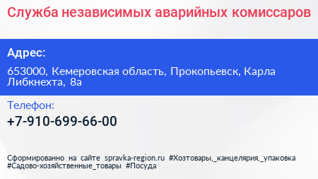 Служба независимых аварийных комиссаров по адресу 653000, Кемеровская область, Прокопьевск, Карла Либкнехта, 8а в дальнейшем Организация, размещена в следующих категориях:
