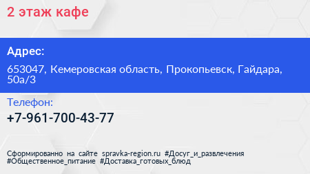 2 этаж, кафе по адресу 653047, Кемеровская область, Прокопьевск, Гайдара, 50а/3 в дальнейшем Организация, размещена в следующих категориях: