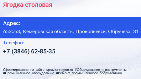 Ягодка, столовая по адресу 653053, Кемеровская область, Прокопьевск, Обручева, 31 в дальнейшем Организация, размещена в следующих категориях: