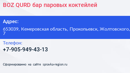 BOZ QURD, бар паровых коктейлей по адресу 653039, Кемеровская область, Прокопьевск, Жолтовского, 7 в дальнейшем Организация, размещена в следующих категориях: