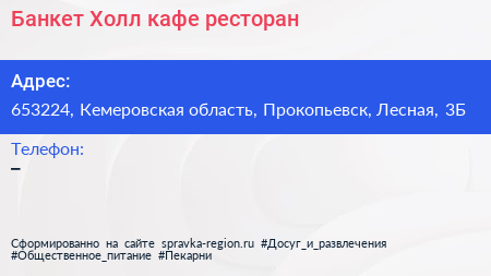 Банкет Холл, кафе-ресторан по адресу 653224, Кемеровская область, Прокопьевск, Лесная, 3Б в дальнейшем Организация, размещена в следующих категориях: