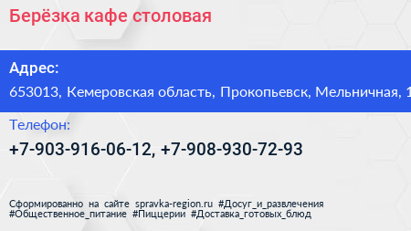 Берёзка, кафе-столовая по адресу 653013, Кемеровская область, Прокопьевск, Мельничная, 1 в дальнейшем Организация, размещена в следующих категориях: