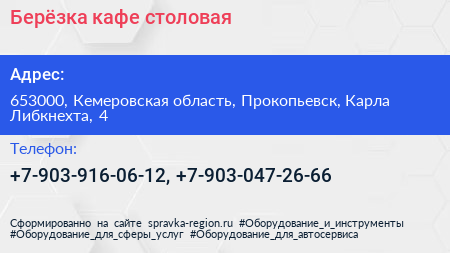 Берёзка, кафе-столовая по адресу 653000, Кемеровская область, Прокопьевск, Карла Либкнехта, 4 в дальнейшем Организация, размещена в следующих категориях: