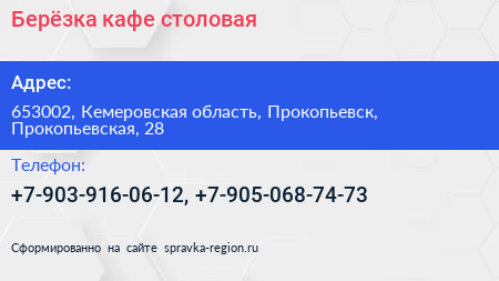 Берёзка, кафе-столовая по адресу 653002, Кемеровская область, Прокопьевск, Прокопьевская, 28 в дальнейшем Организация, размещена в следующих категориях: