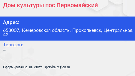 Дом культуры, пос. Первомайский по адресу 653007, Кемеровская область, Прокопьевск, Центральная, 42 в дальнейшем Организация, размещена в следующих категориях: