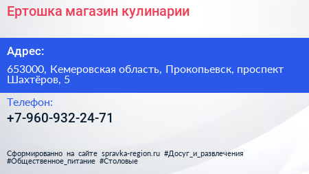 Ертошка, магазин кулинарии по адресу 653000, Кемеровская область, Прокопьевск, проспект Шахтёров, 5 в дальнейшем Организация, размещена в следующих категориях: