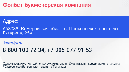 Фонбет, букмекерская компания по адресу 653039, Кемеровская область, Прокопьевск, проспект Гагарина, 25а в дальнейшем Организация, размещена в следующих категориях: