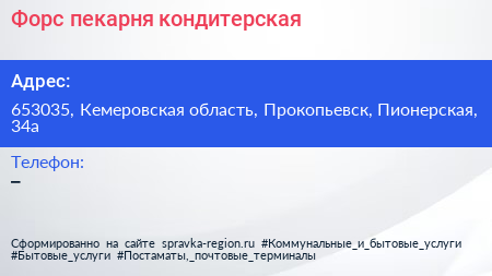 Форс, пекарня-кондитерская по адресу 653035, Кемеровская область, Прокопьевск, Пионерская, 34а в дальнейшем Организация, размещена в следующих категориях: