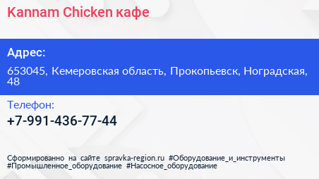 Kannam Chicken, кафе по адресу 653045, Кемеровская область, Прокопьевск, Ноградская, 48 в дальнейшем Организация, размещена в следующих категориях: