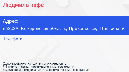 Людмила, кафе по адресу 653039, Кемеровская область, Прокопьевск, Шишкина, 9 в дальнейшем Организация, размещена в следующих категориях: