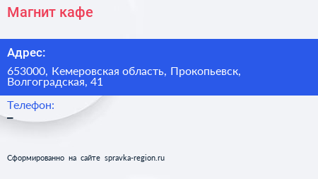Магнит, кафе по адресу 653000, Кемеровская область, Прокопьевск, Волгоградская, 41 в дальнейшем Организация, размещена в следующих категориях: