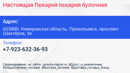 Настоящая Пекарня, пекарня-булочная по адресу 653000, Кемеровская область, Прокопьевск, проспект Шахтёров, 1в в дальнейшем Организация, размещена в следующих категориях: