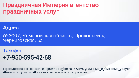 Праздничная Империя, агентство праздничных услуг по адресу 653007, Кемеровская область, Прокопьевск, Черниговская, 5а в дальнейшем Организация, размещена в следующих категориях: