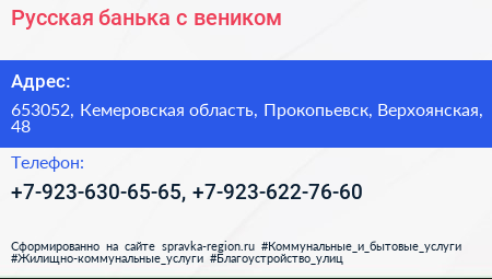 Русская банька с веником по адресу 653052, Кемеровская область, Прокопьевск, Верхоянская, 48 в дальнейшем Организация, размещена в следующих категориях: