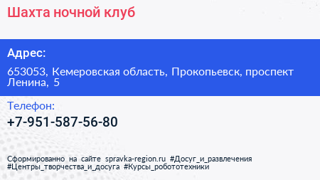 Шахта, ночной клуб по адресу 653053, Кемеровская область, Прокопьевск, проспект Ленина, 5 в дальнейшем Организация, размещена в следующих категориях: