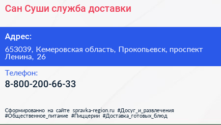 Сан Суши, служба доставки по адресу 653039, Кемеровская область, Прокопьевск, проспект Ленина, 26 в дальнейшем Организация, размещена в следующих категориях: