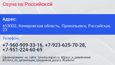 Сауна на Российской по адресу 653002, Кемеровская область, Прокопьевск, Российская, 23 в дальнейшем Организация, размещена в следующих категориях: