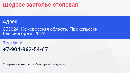 Щедрое застолье, столовая по адресу 653024, Кемеровская область, Прокопьевск, Высокогорная, 14/4 в дальнейшем Организация, размещена в следующих категориях: