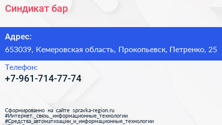 Синдикат, бар по адресу 653039, Кемеровская область, Прокопьевск, Петренко, 25 в дальнейшем Организация, размещена в следующих категориях: