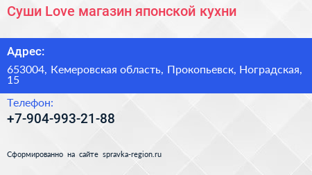 Суши Love, магазин японской кухни по адресу 653004, Кемеровская область, Прокопьевск, Ноградская, 15 в дальнейшем Организация, размещена в следующих категориях: