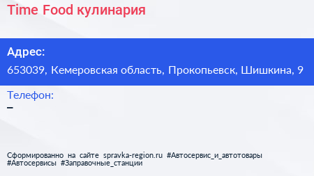 Time Food, кулинария по адресу 653039, Кемеровская область, Прокопьевск, Шишкина, 9 в дальнейшем Организация, размещена в следующих категориях: