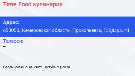Time Food, кулинария по адресу 653053, Кемеровская область, Прокопьевск, Гайдара, 41 в дальнейшем Организация, размещена в следующих категориях: