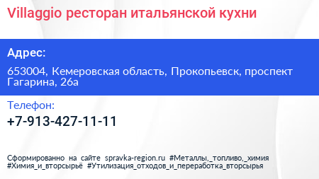 Villaggio, ресторан итальянской кухни по адресу 653004, Кемеровская область, Прокопьевск, проспект Гагарина, 26а в дальнейшем Организация, размещена в следующих категориях:
