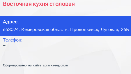 Восточная кухня, столовая по адресу 653024, Кемеровская область, Прокопьевск, Луговая, 26Б в дальнейшем Организация, размещена в следующих категориях: