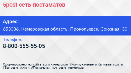 5post, сеть постаматов по адресу 653036, Кемеровская область, Прокопьевск, Союзная, 30 в дальнейшем Организация, размещена в следующих категориях: