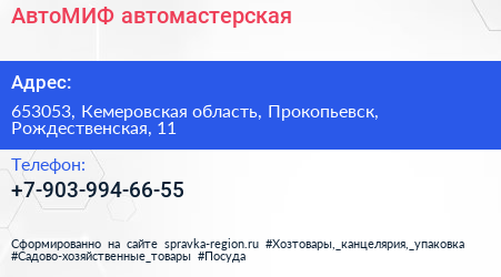 АвтоМИФ, автомастерская по адресу 653053, Кемеровская область, Прокопьевск, Рождественская, 11 в дальнейшем Организация, размещена в следующих категориях: