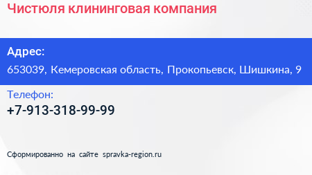 Чистюля, клининговая компания по адресу 653039, Кемеровская область, Прокопьевск, Шишкина, 9 в дальнейшем Организация, размещена в следующих категориях: