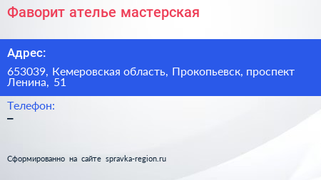 Фаворит, ателье-мастерская по адресу 653039, Кемеровская область, Прокопьевск, проспект Ленина, 51 в дальнейшем Организация, размещена в следующих категориях: