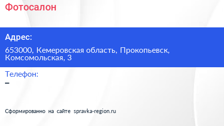 Фотосалон по адресу 653000, Кемеровская область, Прокопьевск, Комсомольская, 3 в дальнейшем Организация, размещена в следующих категориях: