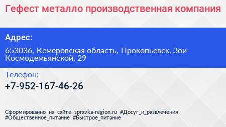 Гефест, металло-производственная компания по адресу 653036, Кемеровская область, Прокопьевск, Зои Космодемьянской, 29 в дальнейшем Организация, размещена в следующих категориях: