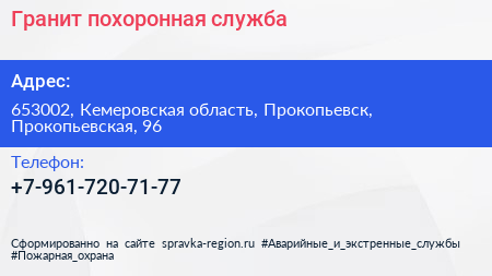 Гранит, похоронная служба по адресу 653002, Кемеровская область, Прокопьевск, Прокопьевская, 96 в дальнейшем Организация, размещена в следующих категориях: