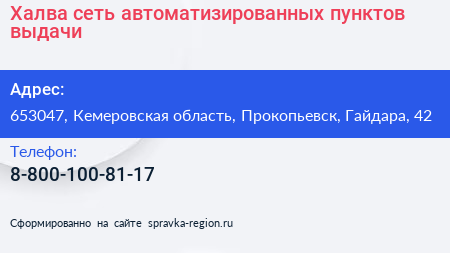 Халва, сеть автоматизированных пунктов выдачи по адресу 653047, Кемеровская область, Прокопьевск, Гайдара, 42 в дальнейшем Организация, размещена в следующих категориях: