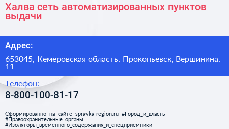 Халва, сеть автоматизированных пунктов выдачи по адресу 653045, Кемеровская область, Прокопьевск, Вершинина, 11 в дальнейшем Организация, размещена в следующих категориях: