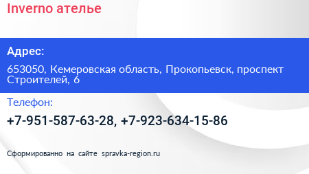 Inverno, ателье по адресу 653050, Кемеровская область, Прокопьевск, проспект Строителей, 6 в дальнейшем Организация, размещена в следующих категориях: