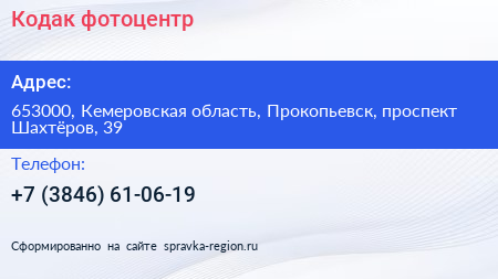 Кодак, фотоцентр по адресу 653000, Кемеровская область, Прокопьевск, проспект Шахтёров, 39 в дальнейшем Организация, размещена в следующих категориях:
