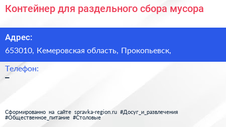 Контейнер для раздельного сбора мусора по адресу 653010, Кемеровская область, Прокопьевск, в дальнейшем Организация, размещена в следующих категориях: