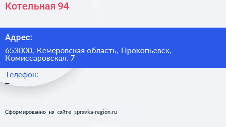 Котельная №94 по адресу 653000, Кемеровская область, Прокопьевск, Комиссаровская, 7 в дальнейшем Организация, размещена в следующих категориях: