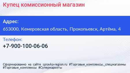Купец, комиссионный магазин по адресу 653000, Кемеровская область, Прокопьевск, Артёма, 4 в дальнейшем Организация, размещена в следующих категориях: