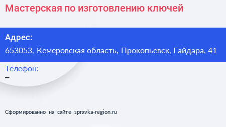 Мастерская по изготовлению ключей по адресу 653053, Кемеровская область, Прокопьевск, Гайдара, 41 в дальнейшем Организация, размещена в следующих категориях: