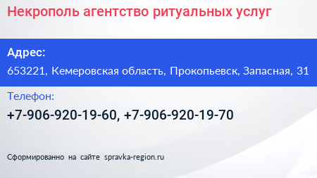 Некрополь, агентство ритуальных услуг по адресу 653221, Кемеровская область, Прокопьевск, Запасная, 31 в дальнейшем Организация, размещена в следующих категориях: