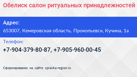 Обелиск, салон ритуальных принадлежностей по адресу 653007, Кемеровская область, Прокопьевск, Кучина, 1а в дальнейшем Организация, размещена в следующих категориях: