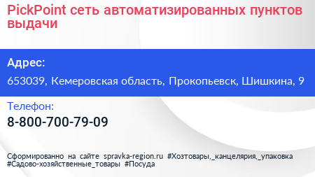 PickPoint, сеть автоматизированных пунктов выдачи по адресу 653039, Кемеровская область, Прокопьевск, Шишкина, 9 в дальнейшем Организация, размещена в следующих категориях: