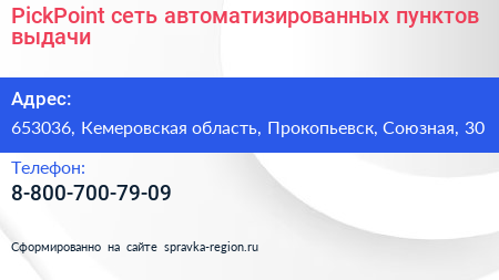 PickPoint, сеть автоматизированных пунктов выдачи по адресу 653036, Кемеровская область, Прокопьевск, Союзная, 30 в дальнейшем Организация, размещена в следующих категориях: