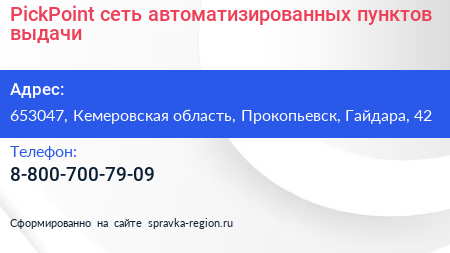 PickPoint, сеть автоматизированных пунктов выдачи по адресу 653047, Кемеровская область, Прокопьевск, Гайдара, 42 в дальнейшем Организация, размещена в следующих категориях: