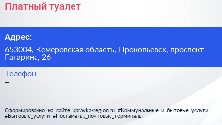 Платный туалет по адресу 653004, Кемеровская область, Прокопьевск, проспект Гагарина, 26 в дальнейшем Организация, размещена в следующих категориях: