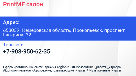 PrintME!, салон по адресу 653039, Кемеровская область, Прокопьевск, проспект Гагарина, 32 в дальнейшем Организация, размещена в следующих категориях: